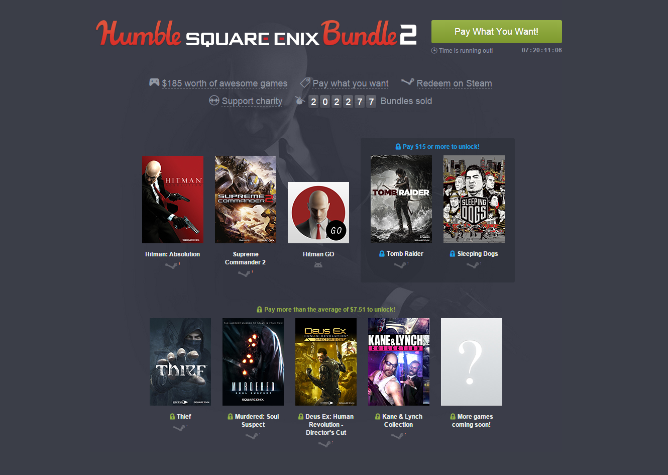 This time around it's Square Enix's time in the spotlight and they have a hell of a bundle to support charity. Featured in this bundle for $1 or more is: Hitman: Absolution, Supreme Commander 2, and Hitman GO. If you pay more then the current average of $7.51 you get: Thief, Murdered: Soul Suspect, Deus Ex: Human Revolution - Director's Cut, Kane & Lynch Collection, and more games coming soon. Finally, paying $15 or more gets you Tomb Raider and Sleeping Dogs. Of course if you buy the second tier of games you get the first tier, and if you buy the third tier of games you get the first and second as well.